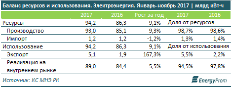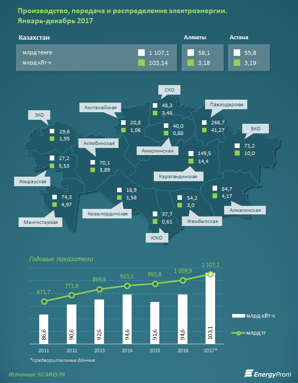 В 2017 году электроэнергетики РК произвели 103,1 миллиарда киловатт/час электроэнергии - на 9,2 процента больше, чем годом ранее. Более половины пришлось на ключевые промышленные регионы - Павлодарскую (41,3 миллиарда киловатт/час, +20,7 процента за год) и Карагандинскую (14,4 миллиарда киловатт/час, +2,6 процента за год) области.