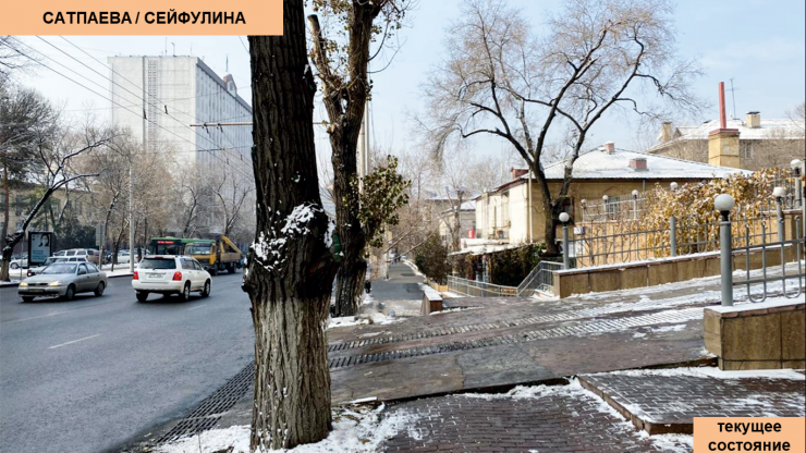 По данным акимата, общая длина проектируемого участка по улице Сатпаева 3,9 километра. Основной проблемой улицы является ее чрезмерная ширина (от Достык до Назарбаева). Когда-то она использовалась для проведения парадов военной техники. В управлении отметили, что сейчас такой необходимости нет, но есть необходимость создания комфортных городских пространств, расширения тротуара, озеленения.