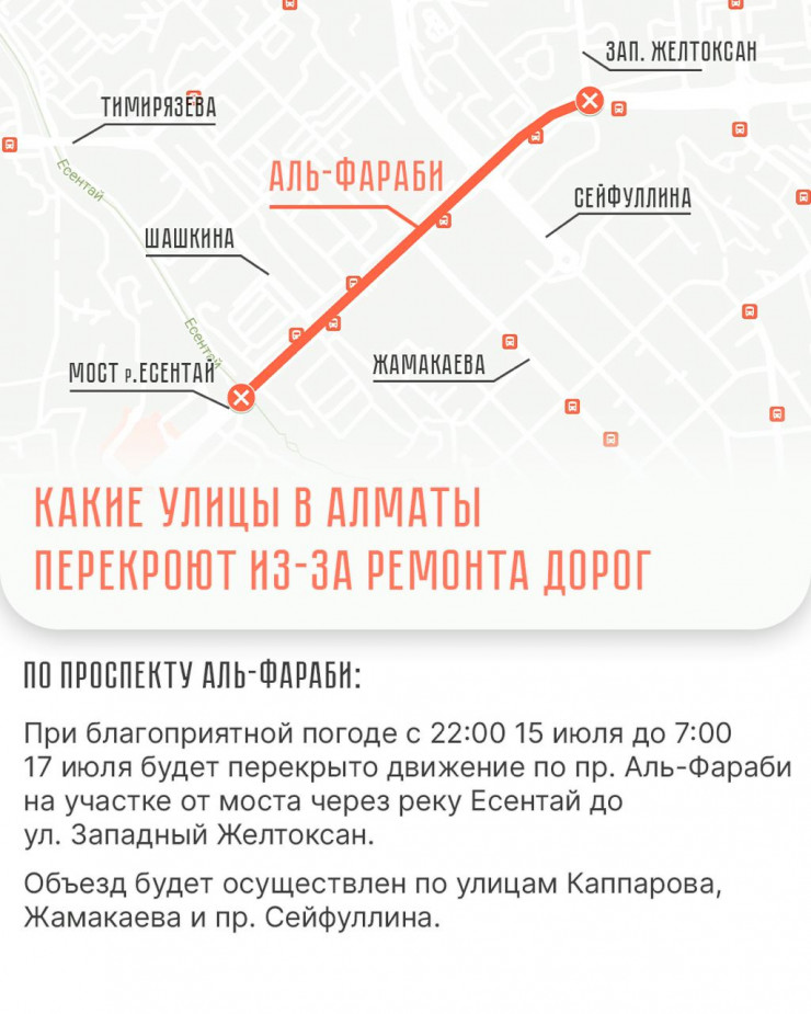 Движение откроют по проспекту Аль-Фараби от улицы Жарокова до Жаксылыка Ушкемпирова.