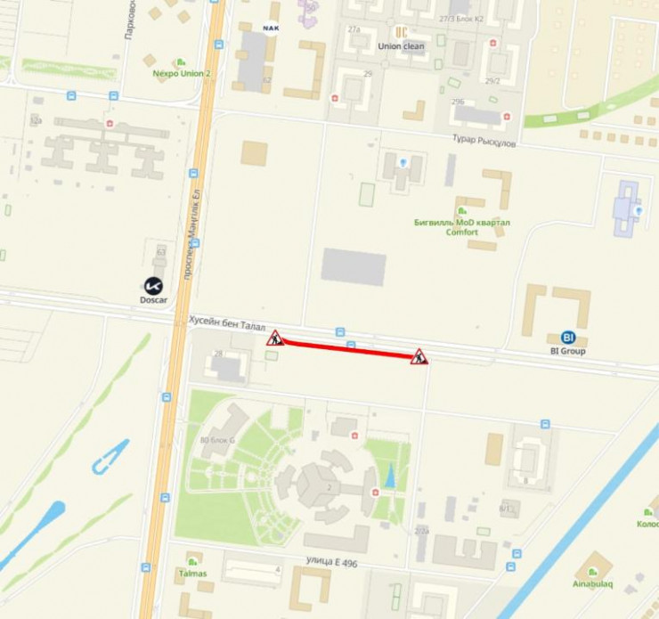 Кроме того, с 26 июля по 26 августа будет полностью перекрыто движение по второстепенной дороге вдоль улицы Хусейн Бен Талал от проспекта Мангилик Ел для проведения работ по строительству тепломагистрали 6 ввода.