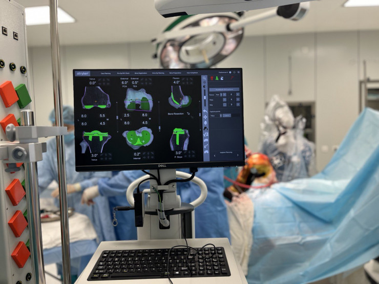 Специально для проведения операций на суставах с точностью до сотых долей миллиметра в центр привезли уникальную роботизированную систему. Благодаря 3D-сканам поврежденной зоны робот позволяет поместить в сустав пациента имплантат с математически безупречным расчетом всех параметров. Операцию проводят через компьютерную навигацию благодаря IT-специалистам.