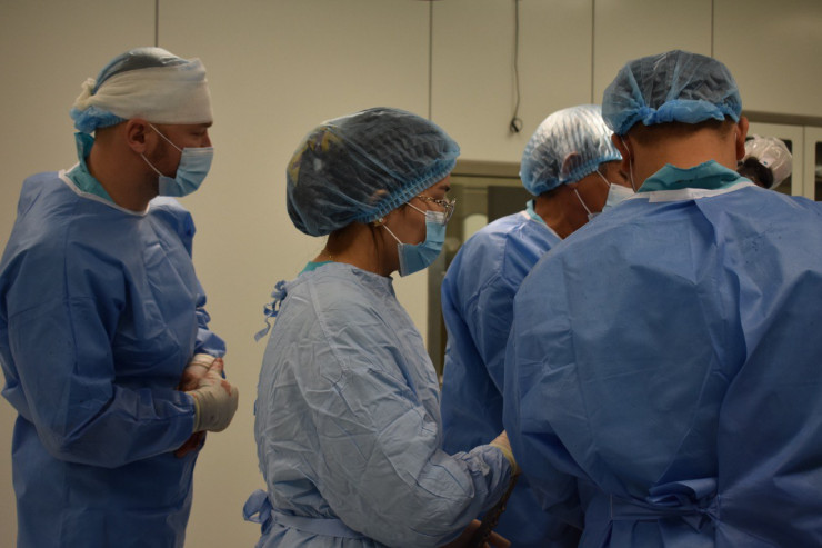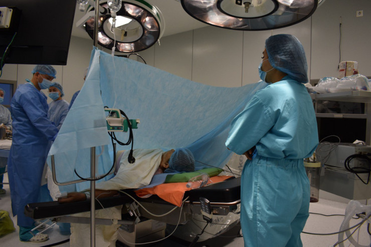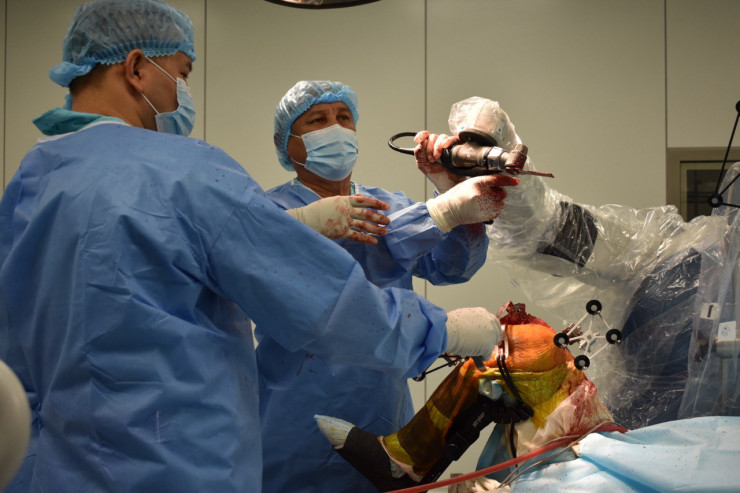 Когда я зашла в операционный зал, в залитой светом комнате команда врачей уже приступила к операции. Над операционным столом склонились врач травматолог-ортопед, кандидат медицинских наук Кайрат Ашимов, руководитель Республиканского центра эндопротезирования суставов, врач травматолог-ортопед, кандидат медицинских наук Алексей Белокобылов, российский врач травматолог-ортопед Алексей Шумский и уникальный робот-ассистент.