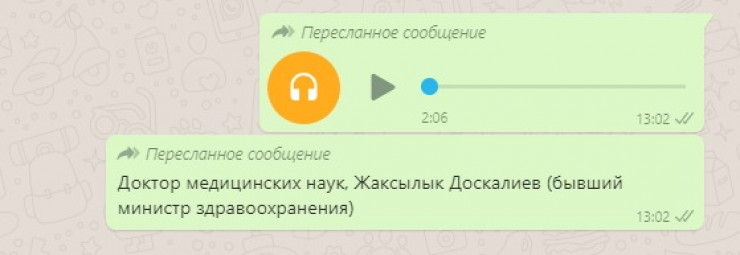 Голосовое сообщение распространяют якобы от имени доктора медицинских наук, экс-министра здравоохранения Жаксылыка Доскалиева. "Самое надежное средство от коронавируса - это чеснок. Каждое утро, поднявшись, пока ничего не проглотил, не попил... Ничего не есть, пока не проведете эту процедуру. Зубок чеснока мелко накрошите и глотаете, запивая водой как таблетки. Не жевать", - звучал совет в рассылке.
