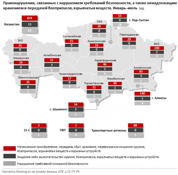 C января по июль в Казахстане было зарегистрировано 874 уголовных правонарушения, связанных с незаконным приобретением, передачей, сбытом, хранением, перевозкой или ношением оружия, боеприпасов, взрывчатых веществ и взрывных устройств.
