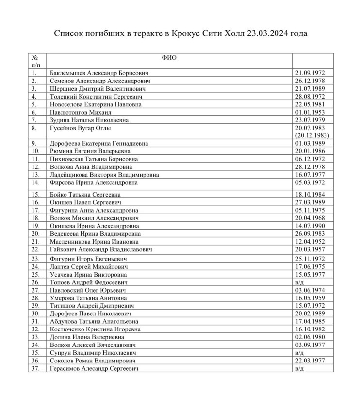 Тем временем минздрав Подмосковья опубликовал список погибших после теракта в "Крокусе". В него вошли первые 37 человек, которых удалось опознать.
