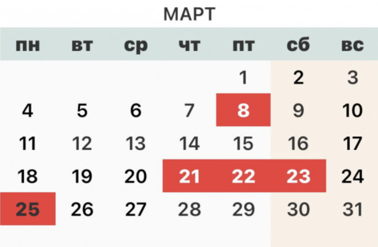 Что касается шестидневной рабочей недели, то понедельник, 25 марта - рабочий день, а 21, 22, 23 и 24 марта являются выходными.