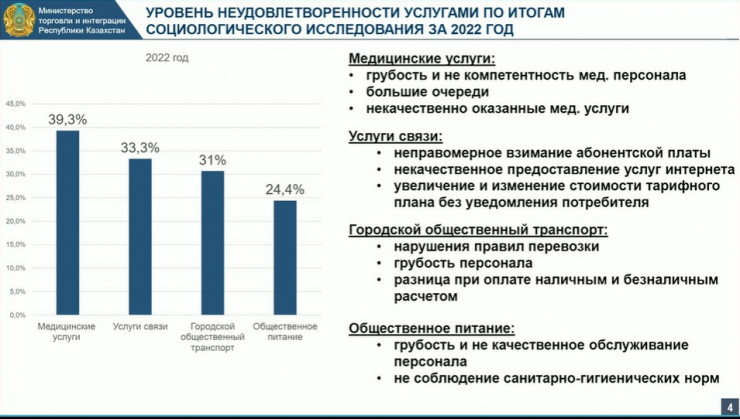 Выступая с докладом по вопросу защиты прав потребителей, Жумангарин привел данные социологического исследования, в котором была представлена информация об уровне неудовлетворенности услугами по итогам 2022 года.