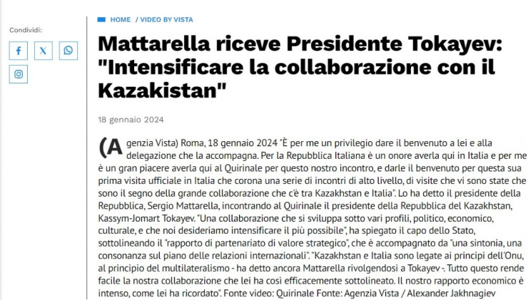 Как пишет Libero, президент Италии Серджио Маттарелла на встрече с Касым-Жомартом Токаевым рассказал о сотрудничестве.