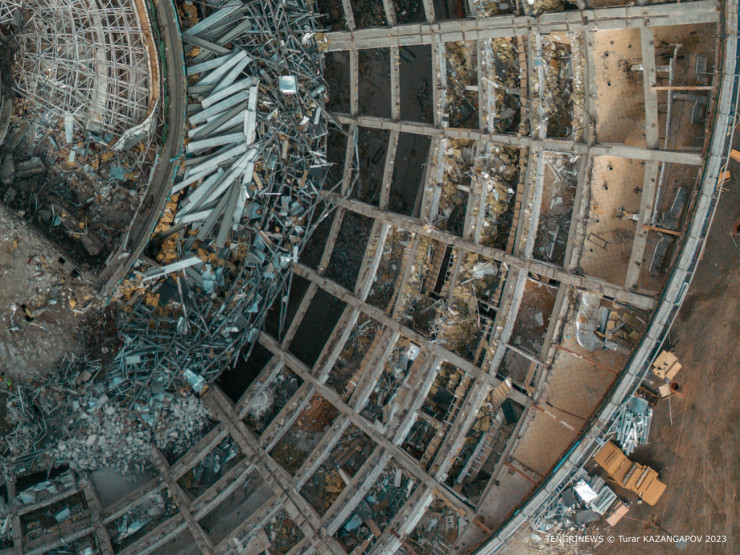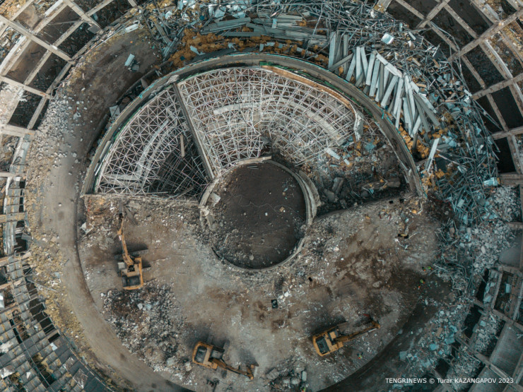 Фото и видео амфитеатра появились на портале Massaget.kz. На кадрах Дворец творчества выглядит так, словно его сносят: на территории работает спецтехника и объект больше напоминает руины.