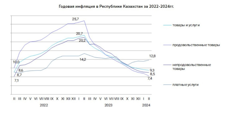 В годовом исчислении инфляция в Казахстане замедлилась и составила 9,3 процента (в январе - 9,5 процента). За год больше цены повысились: платные услуги - на 12,8 процента, непродовольственные товары - на 8,5 процента, продовольственные товары - на 7,4 процента.