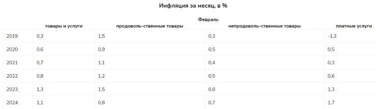 По данным бюро, за февраль инфляция ускорилась и составила 1,1 процента (в январе - 0,8 процента). За месяц подорожали платные услуги - на 1,7 процента, продовольственные товары - на 0,8 процента, непродовольственные товары – на 0,7 процента.