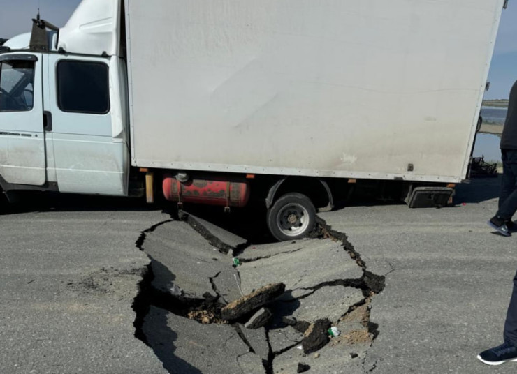 В Атырауской области грузовик провалился в огромную яму на трассе. Инцидент произошел на 27-м километре участка автодороги местного значения Атырау - Индер.