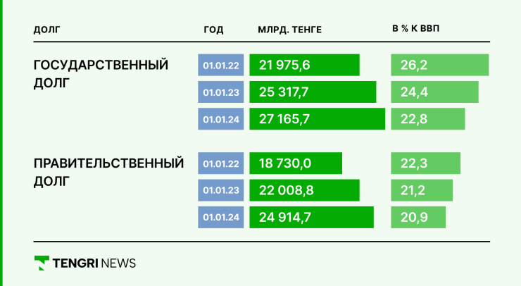 По информации министра финансов, на 1 января 2024 года госдолг составил 27 триллионов тенге. По отношению к ВВП он составляет 22,8 процента.