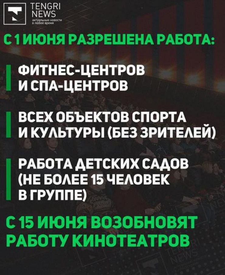 По данным акимата, планировалось разрешить деятельность ЦОНов, детских садов и организаций дополнительного образования не более 15 человек в группе, авто- и железнодорожных вокзалов, объектов культуры и спорта без зрителей, парков и скверов, фитнес-клубов и spa-салонов вне банных комплексов.