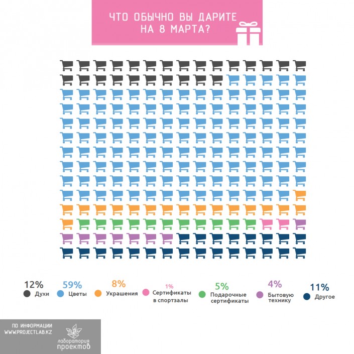 Ранее служба исследований компании HeadHunter назвала самые популярные и оригинальные подарки казахстанцев на 8 Марта. В этот список вошли путевка в Данию, Таиланд и Париж, предложение руки и сердца, фотографии с приглашением на концерт, цветы от супруга, который находился в далекой степи, открытку с живыми бабочками. Также согласно их исследованию, каждый третий казахстанец планировал потратить на подарки не более 10 тысяч тенге, а 20,7 процента опрошенных еще не планировали предстоящие расходы на подарки.