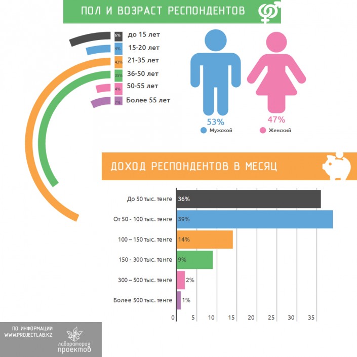 В опросе приняли участие 300 человек со всего Казахстана, 53 процента из которых - мужчины, 47 процентов - женщины, а 43 процента опрошенных - это люди в возрасте от 21 до 35 лет, 35 процентов - от 35 до 50 лет и 7 процентов - от 55 лет и старше.