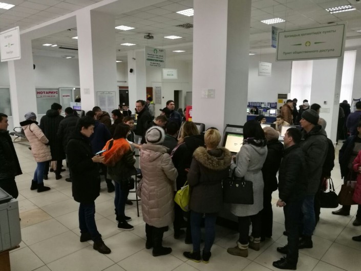 Люди стоят в очередях перед терминалами, которые выдают адресные справки. Также очереди наблюдаются в справочную, где выдают талоны на услуги.