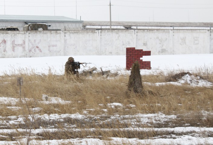 "Это у нас так называемое "поле памяти". Есть у нас в штате снайперы. Их руководитель отворачивается назад, а они тем временем маскируются, а потом он их обнаруживает", - сказал Нурлан Карибаев, показывая на чистое поле в полигоне.