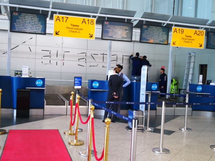Как разъяснили в компании MYD production, которая сейчас является единым рекламным оператором в международном аэропорту Алматы (МАА), был демонтирован только логотип компании на стене за стойкой регистрации.