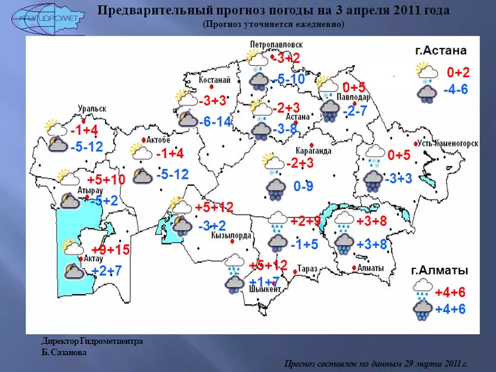 В день выборов президента Казахстана 3 апреля в Астане ожидаются осадки, температура воздуха составит 0+2 градуса, передает РГП "Казгидромет". Ночью в городе выпадет снег, температура опустится до -4-6 градусов. В Алматы, по прогнозам синоптиков, в день выборов будет дождливо. Воздух ночью и днем прогреется до +4+6 градусов. Осадки и порывистый ветер также ожидаются на севере, востоке и в центре Казахстана. Снег выпадет в Павлодаре, Усть-Каменогорске и Караганде. Ночью столбики термометров опустятся до -10 градусов, днем температура воздуха составит -3+5 градусов. В Западном Казахстане будет преобладать теплая и малооблачная погода. Ночью температурный фон составит -5+7 градусов. В Актюбинской области будет прохладнее: ночью -12 градусов, днем +4+15. Напомним, внеочередные выборы Президента Казахстана назначены на 3 апреля. На пост главы государства претендуют четыре кандидата, в том числе действующий Президент Казахстана Нурсултан Назарбаев.