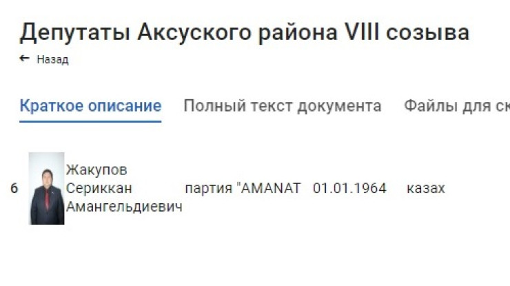 На сайте местного маслихата Сериккан Жакупов все еще указан депутатом районного маслихата VIII созыва. В графе дата рождения указан 1964 год (60 лет) при том, что в полиции сообщали о задержании 40-летнего подозреваемого. Не исключено, что дата его рождения на сайте указана неверно, потому что такая же дата указана у другого депутата, расположенного в списке по соседству.