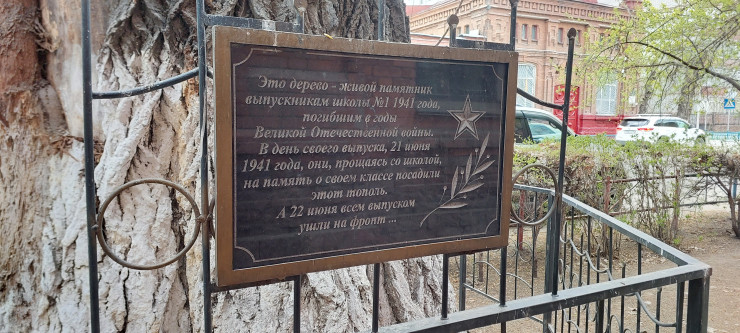 "Это дерево - живой памятник выпускникам школы №1 1941 года, погибшим в годы Великой Отечественной войны. В день своего выпуска, 21 июня 1941 года, они, прощаясь со школой, на память о своем классе посадили этот тополь. 22 июня всем выпуском ушли на фронт..." - говорится на доске.