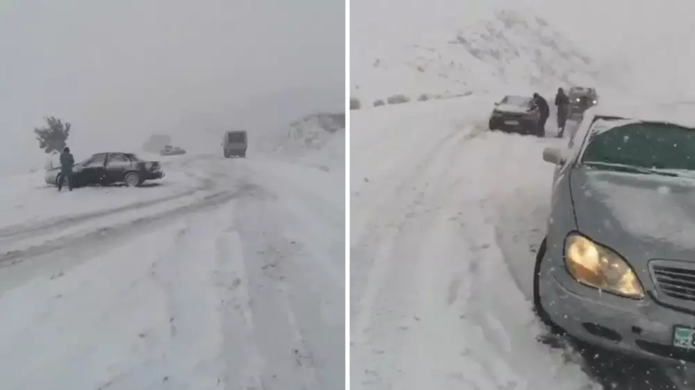 Видео с места появилось на странице kris.p.online. Автор ролика рассказывает, что машины застряли на перевале в селе Кеген Алматинской области. Это примерно в 200 километрах от Алматы. На кадрах видно, как дорогу замело снегом.