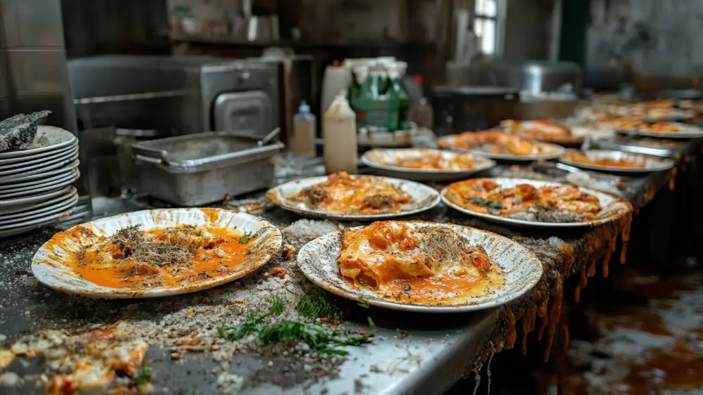 На кадрах видео женщина показывает холодильники с недоеденной едой, собранной из тарелок, а также пакеты с котлетами, по ее словам, не первой свежести.