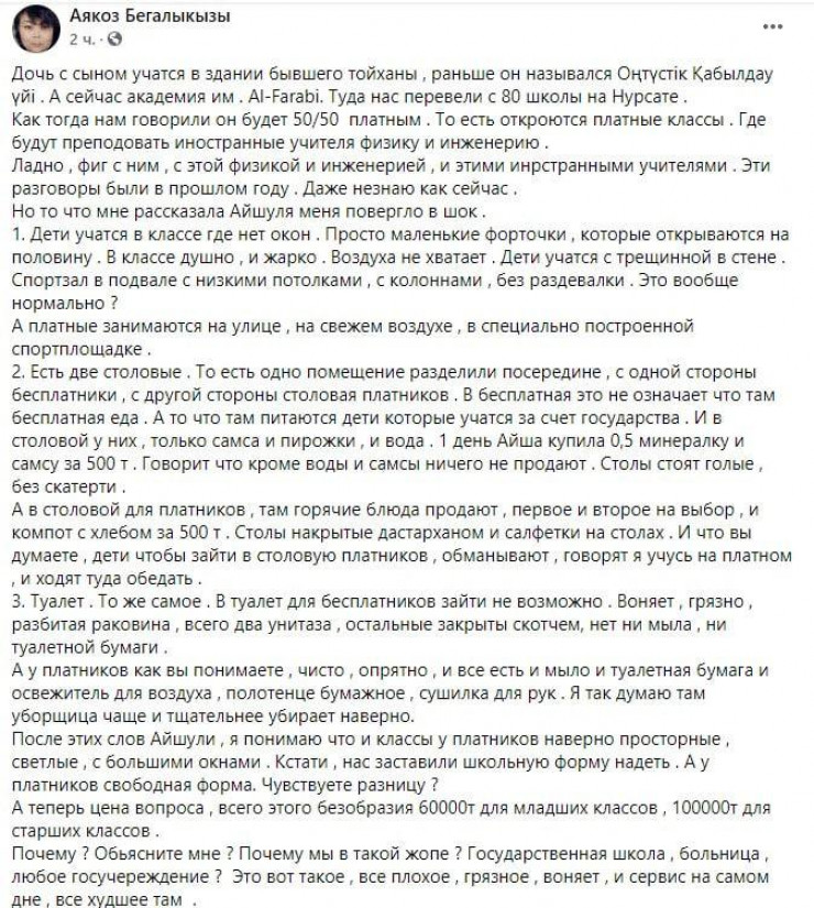Жительница Шымкента Аякоз Бегалыкызы в соцсетях пожаловалась на частную школу Al-Farabi academialyq mekteb, куда недавно перевели ее сына и дочь из государственной школы № 80 в микрорайоне Нурсат. Сама школа расположилась в здании бывшей тойханы. По словам Аякоз, родителям сразу сообщили, что обучение может быть частично платным, но платить они будут только за дополнительные занятия у зарубежных учителей. Однако после начала учебного года ее сын сообщил, что в школе для учеников, которые обучаются за счет бюджетных средств, созданы плохие условия. Школьники учатся в небольших душных классах, без окон, только с маленькими форточками. Спортзал школы располагается в подвале. В то же время ученики платного отделения занимаются на улице, на свежем воздухе.