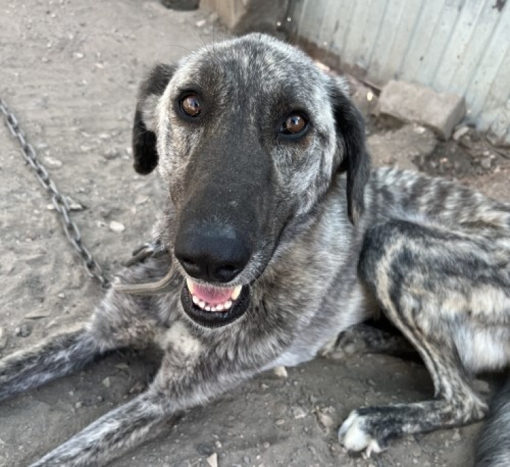 Еще одна собака - Смишка, ей 4 года. Метис тазы и стаффорда. От тазы собака унаследовала изящную фигуру, а от стаффорда – тигровый окрас. Легко может перемахнуть двухметровый забор. Обожает ласку и внимание.
