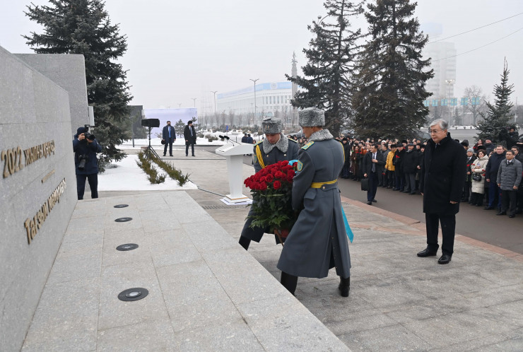 Токаев возложил цветы к стеле. Присутствующие почтили память погибших минутой молчания, затем прозвучал государственный гимн.