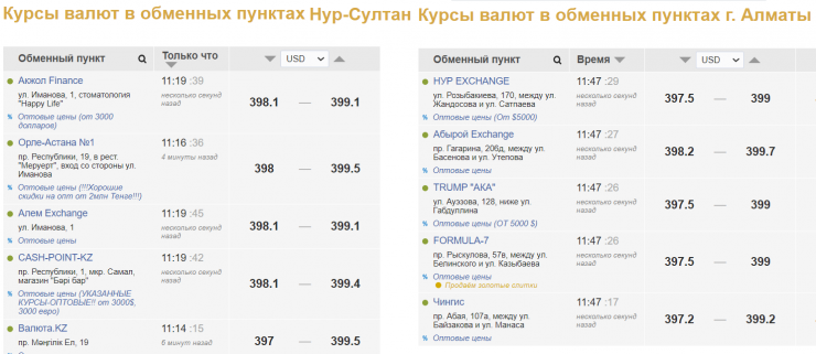 По данным kurs.kz, в настоящее время обменные пункты Нур-Султана продают доллар по 399,1-399,5 тенге и покупают по 397-398,1 тенге. Обменники Алматы продают валюту по 399-400 тенге, покупают - по 397,5-398,2 тенге.