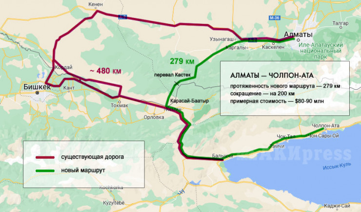 "Кыргызская Республика поднимает вопрос строительства прямой дороги от озера Иссык-Куль в город Алматы. На сегодняшний день по предложению кыргызской стороны рассматривается маршрут: Алматы - Узынагаш - Кастек - Михайловка - Чолпон-Ата протяженностью 280 километров", - сообщили в комитете.