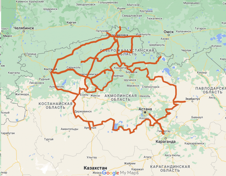 - Екатеринбург - Алматы, километры 729-856, участок граница Костанайской области - граница Акмолинской области;