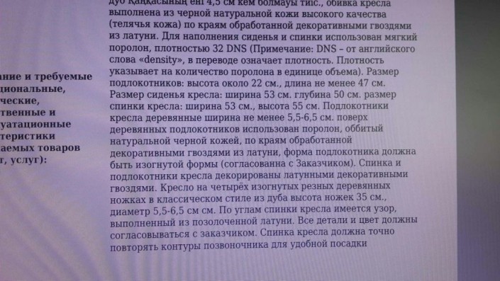 При этом стоимость одного кресла, предназначенного для руководителя Управления делами акима Актюбинской области, 630 тысяч тенге. Судя по описанию, оно должно быть из натуральной телячьей кожи высокого качества, по краям обработанной декоративными гвоздями из латуни. Кроме того, кресло акимат хочет заказать с узором, выполненным из позолоченной латуни.