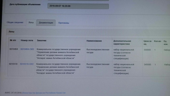 Акимат Актюбинской области разместил еще несколько лотов на открытом сайте государственных закупок. Корреспондент Tengrinews.kz, помимо кресла с позолоченными элементами, обнаружил заказ других предметов роскоши, а именно - набор "высокохудожественной посуды" стоимостью 540 тысяч тенге, художественных картин за 1,5 миллиона тенге, водопад по стеклу за 1,6 миллиона тенге, штор за 1,8 миллиона тенге.