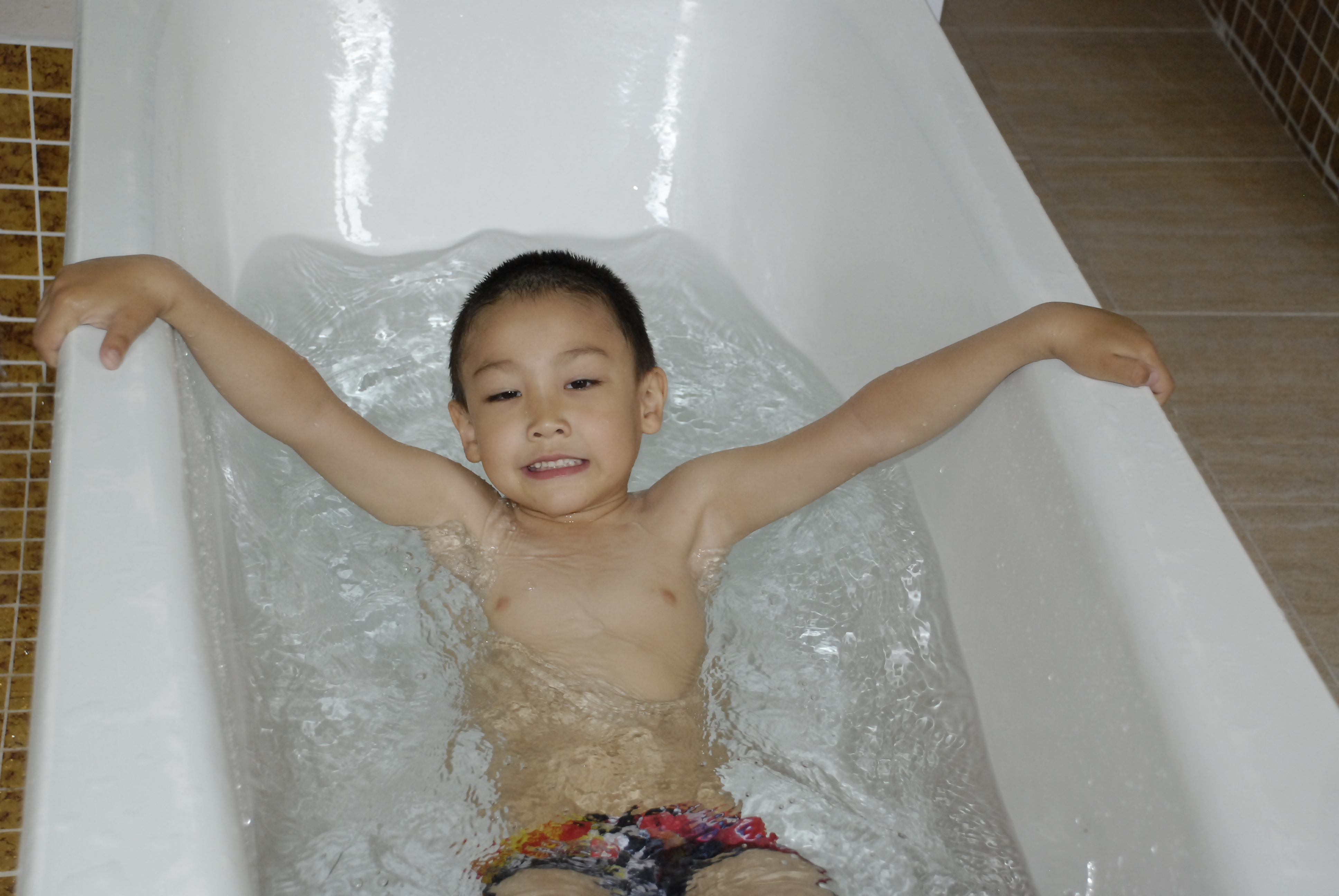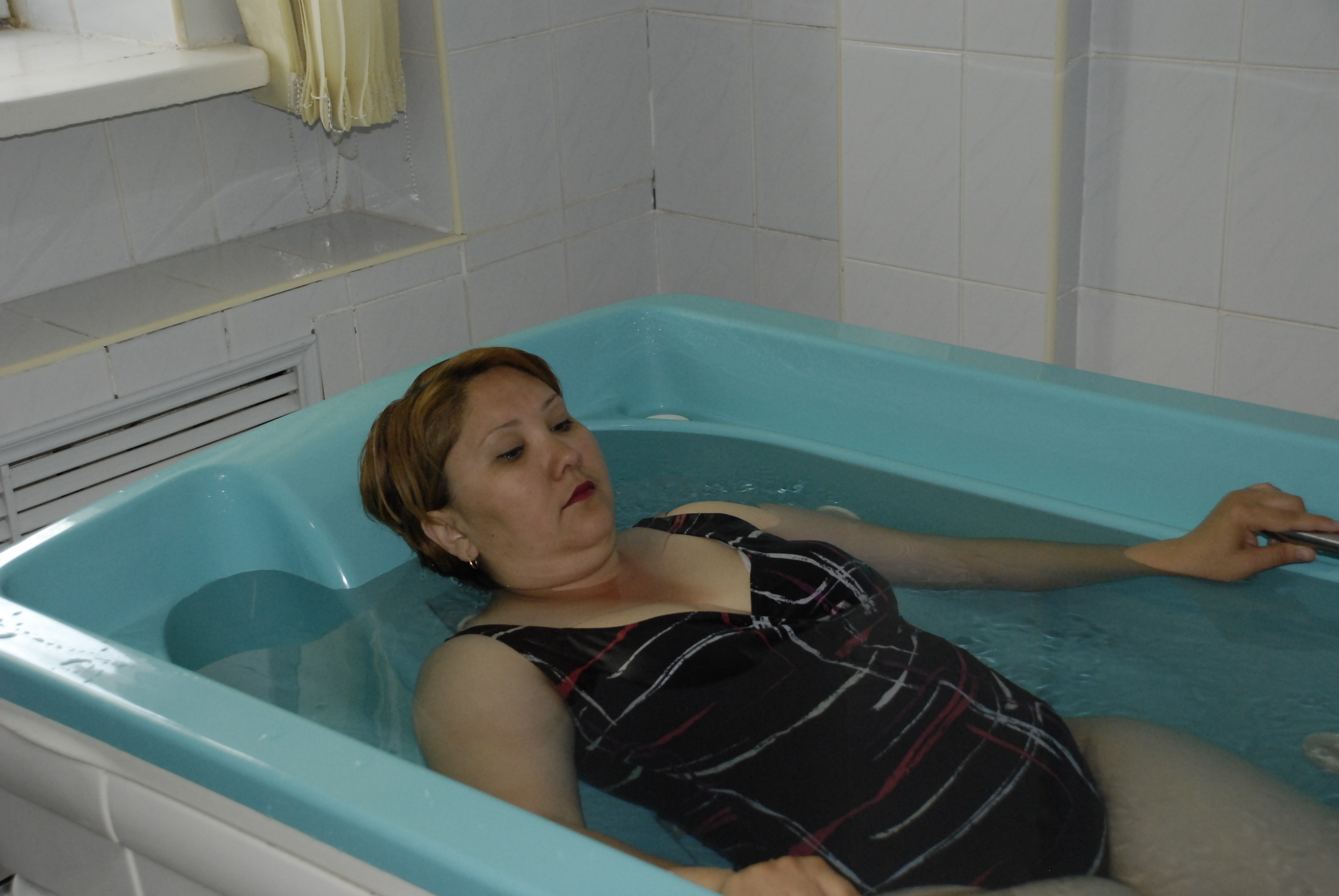 Отдыхающая санатория принимает радоновую ванну с подводным душем-массажем