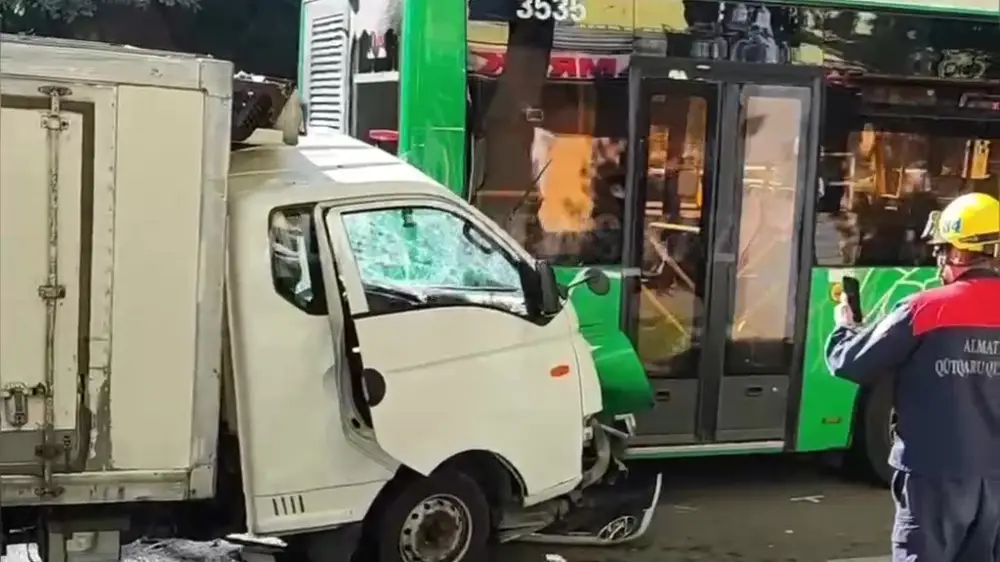 "Водитель автомобиля Hyundai Porter не справился с рулевым управлением и столкнулся с машиной Toyota Land Cruiser и пассажирским автобусом, которые ехали в попутном направлении. К расследованию ДТП приступили сотрудники отдела полиции Бостандыкского района", - сообщили в ведомстве.
