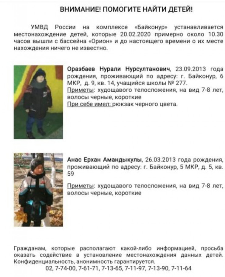 "Действующими на комплексе "Байконур" российскими и казахстанскими правоохранительными органами, администрацией города Байконур и иными уполномоченными органами принимаются все возможные меры в целях установления местонахождения пропавших детей, детального выяснения обстоятельств данного происшествия. Ход расследования уголовного дела находится на особом контроле прокурора комплекса", - сообщили в прокуратуре комплекса "Байконур".