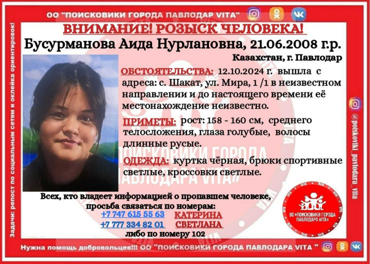 16-летняя Аида Бусурманова и 14-летняя Снежана Бабий пропали 12 октября. Сообщается, что подростки вышли с адреса село Шакат, улица Мира, 1/1 в неизвестном направлении и до настоящего времени их местонахождение неизвестно.