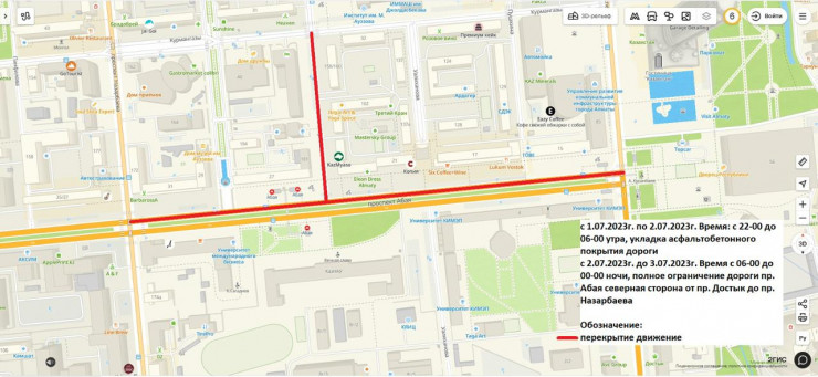 "В связи с проведением работ по укладке асфальтобетонного покрытия в рамках среднего ремонта с 1 по 3 июля текущего года с 22:00 часов до 06:00 часов утра в ночное время будет полностью ограничено движение по северной стороне проспекта Абая на участке от проспекта Достык до проспекта Назарбаева. Дорожное движение по проспекту Абая от проспекта Достык до проспекта Назарбаева в западном направлении будет организовано по южной стороне проспекта Абая", - говорится в сообщении акимата Алматы.