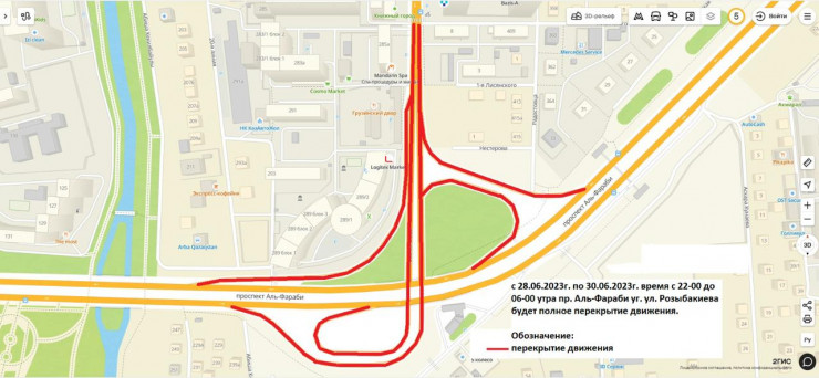 "В связи асфальтированием проезжей части полное перекрытие дороги предусмотрено в тоннельной части транспортной развязки по проспекту Аль-Фараби на пересечении с улицей Розыбакиева с 28 по 30 июня текущего года с 22:00 часов до 06:00 часов утра в ночное время. Движение автотранспорта в северном и восточном направлениях будет обеспечено по улицам Кожабекова, Навои и Гагарина", - добавили в акимате.