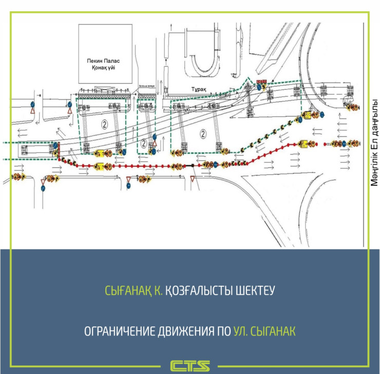 С 8 июля по 31 августа на участке улицы Сыганак от улицы Туркестан до развязки проспекта Мангилик Ел будет частично ограничено движение за счет сужения полос. При этом правоповоротный съезд со стороны улицы Достык на улицу Сыганак будет закрыт. На этом участке пройдут работы по устройству ростверков, опор и ригелей.