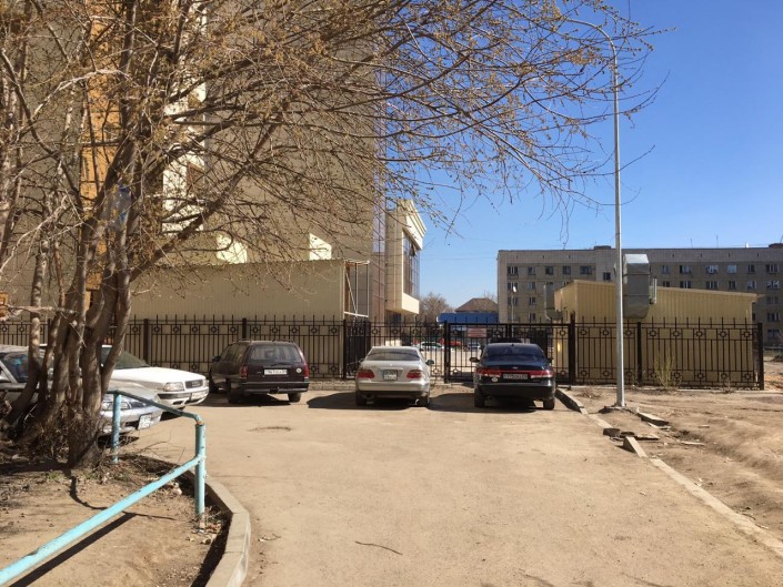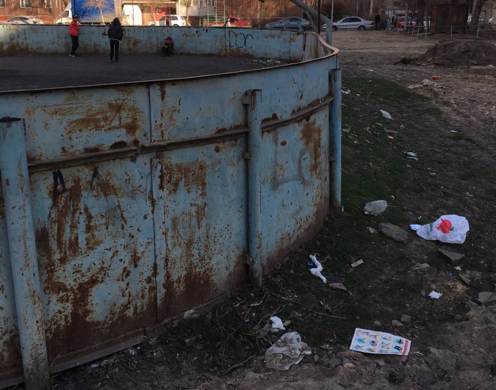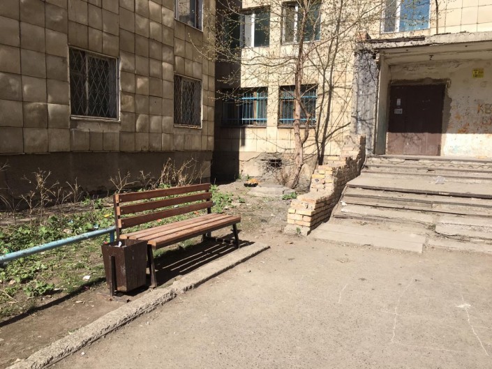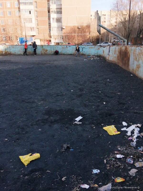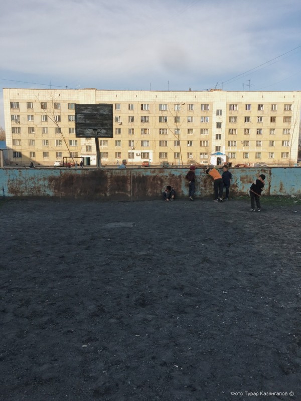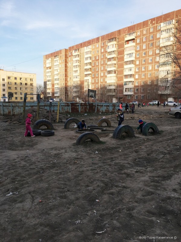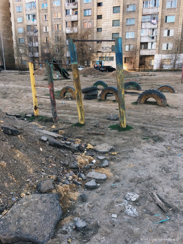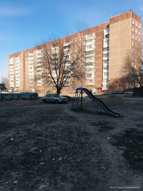 Дом стоит по проспекту Бухар Жырау, 92. Это центр Караганды. Мы видим горы мусора, заборы и турники разъела ржавчина, автомобили припаркованы прямо на детской площадке. Единственное развлечение для детей - наполовину закопанные в землю старые автомобильные шины.
