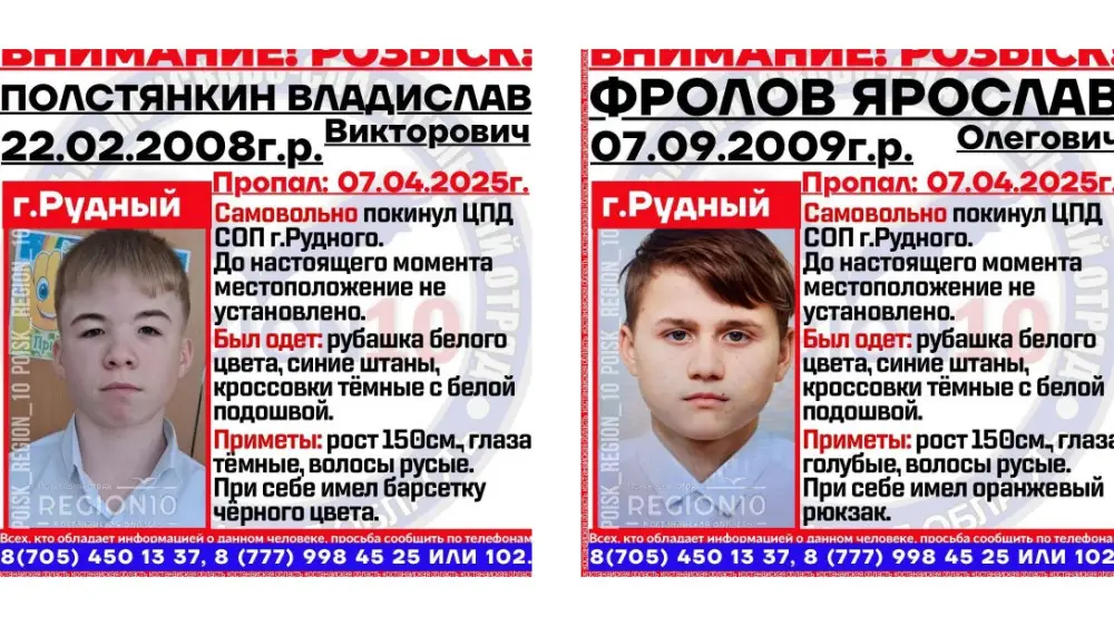 Департамент полиции Костанайской области призывает граждан, обладающих какой-либо информацией о местонахождении несовершеннолетних, обращаться по телефону 102.