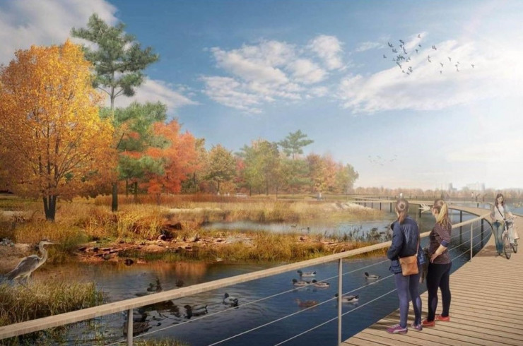 Отмечается, что также появится прогулочная инфраструктура: террасная набережная на прибрежных водно-болотных угодьях, будут сохранены и созданы условия для экоклимата с флорой и фауной.