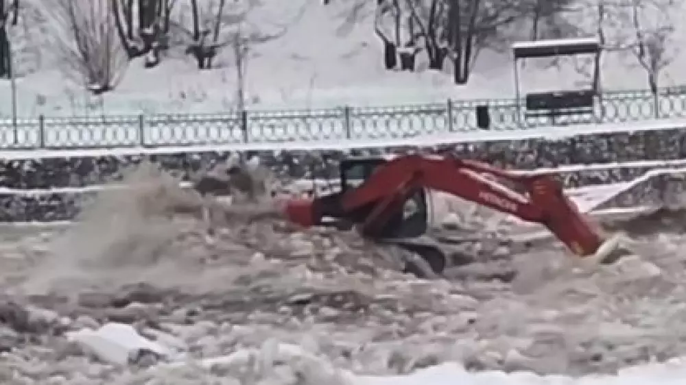 Экскаватор попал под ледово-водный поток в реке Есентай в Алматы