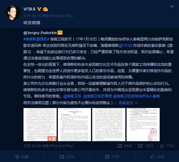 Китайские СМИ сообщили, что представитель Витаса предъявил претензии к телеканалу Hunan TV, который транслирует конкурс I am a Singer. Отмечается, что певца не устроило то, что конкурсант из Казахстана Димаш Кудайбергенов спел его песню "Опера №2", и теперь он требует гонорар за использование этой композиции.