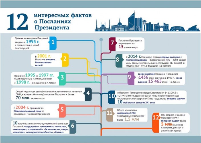 Между тем, на официальной странице пресс-службы Президента Казахстана в Facebook опубликована любопытная инфографика - "12 интересных фактов о Посланиях Президента".