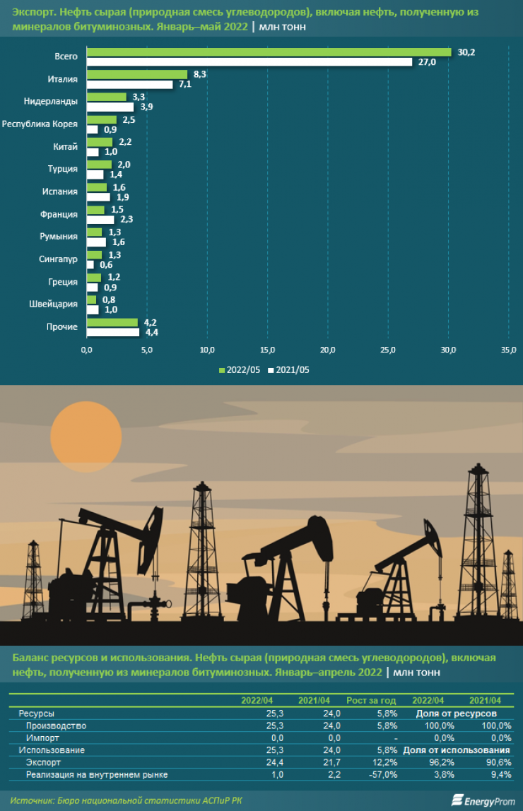 Экспорт нефти также вырос в первой половине этого года. За январь-май 2022 года было экспортировано 30,2 миллиона тонн сырой нефти и сырых нефтепродуктов - на 12,1 процента больше, чем за такой же период прошлого года. Половина этого объема была отправлена в Италию (8,3 миллиона тонн), Нидерланды (3,3 миллиона тонн), Южную Корею (2,5 миллиона тонн) и Китай (2,2 миллиона тонн).
